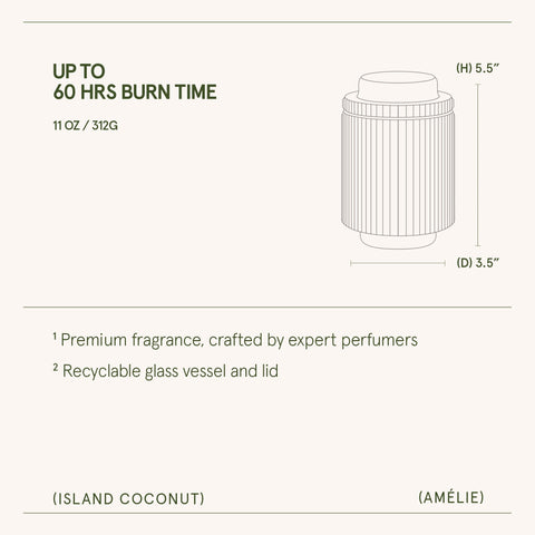Transport yourself to a tropical paradise with the Amélie Island Coconut Candle, where creamy coconut and sweet vanilla bean mingle with warm tonka and sandalwood. This luscious fragrance captures the essence of sunlit shores, infusing your space with a serene and exotic escape.