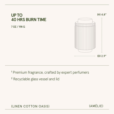 The Amélie Linen Cotton Oasis Candle wraps your space in the comforting freshness of cool cotton, softened by white jasmine and geranium. Warm cedarwood and musk provide a grounding finish, evoking the serene bliss of sun-dried linens on a tranquil morning. Perfect for creating a cozy and inviting retreat, every moment feels effortlessly refreshed.