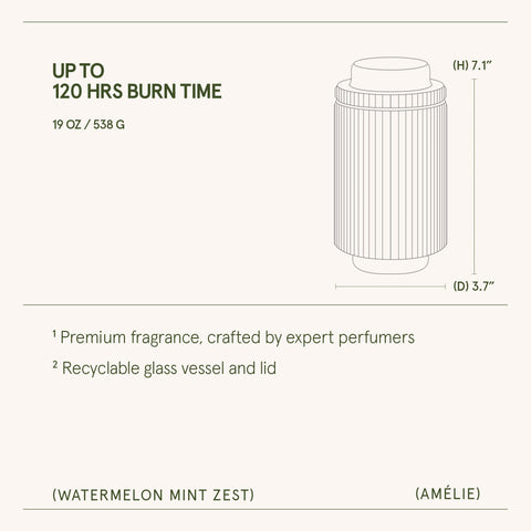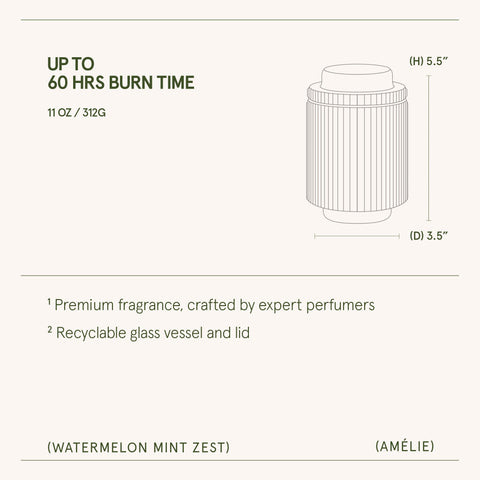 Refresh your senses with the Amélie Watermelon Mint Zest Candle, where cool watermelon and crisp mint meet a subtle hint of chili pepper and musk. This energizing fragrance infuses your space with a revitalizing, summery charm all year round.
