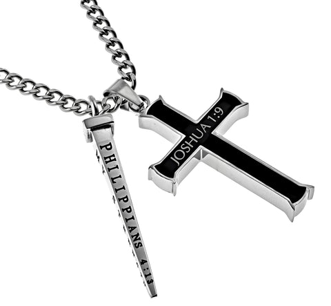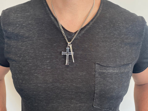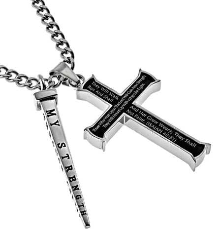 Men's Solid Stainless Steel Cross with high polish finish outer casing and ebony middle. Front and back Scripture is electroplated into the Cross. Cross size 1 3/4" x 1". Solid Stainless steel high polished “Nail” with 4 sided engraving and black enameling. Nail measures 1 ¾” x ¼” at widest point. Available on 20” or 24” high polish stainless steel curb chain. Both pieces are detachable. Every order comes with complimentary velvet gift bag. Orders ship in 1-2 business days from Phoenix, Arizona.