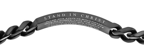Men's 316L stainless steel powder coat black finished bracelet with sport mesh pattern perforations show underneath to high polish interior. Top side of bracelet reads scripture of choice. Bracelet measures 8 1/2” long. Every order comes with complimentary velvet gift bag. Orders ship in 1-2 business days from Phoenix, Arizona.