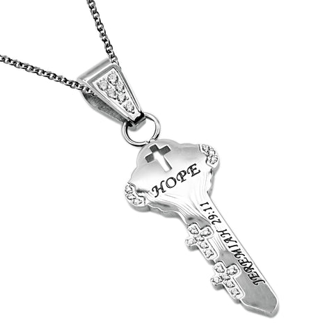 Women's Petite Stainless Steel KEY with cut out cross handle, and two CZ cross key edges; high polish finish. Front engraving with black enamel fill.  Every order comes with complimentary velvet gift bag. Orders ship in 1-2 business days from Phoenix, Arizona