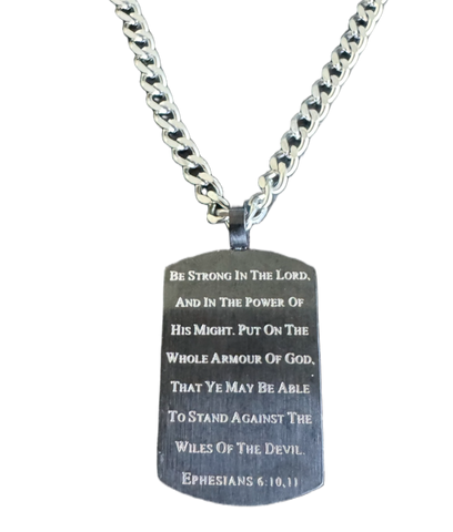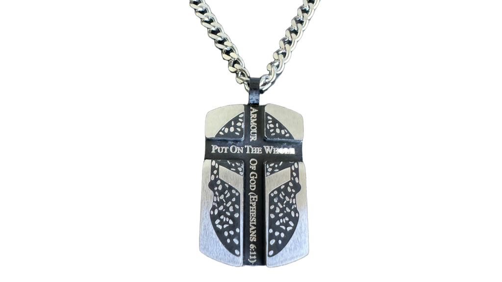 Men's Stainless Steel matte black finish and engraved pattern shield with high polish built in cross. Front side has diamond back engraved pattern with high polished bottom tab on cross. Engraved with Scripture of Choice Shield size 1” x 1 1/2”. Includes upgraded 316L Stainless Steel Curb Chain with lobster clasp. Every order comes with complimentary velvet gift bag. Orders ship in 1-2 business days from our distribution center Phoenix, Arizona.