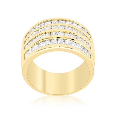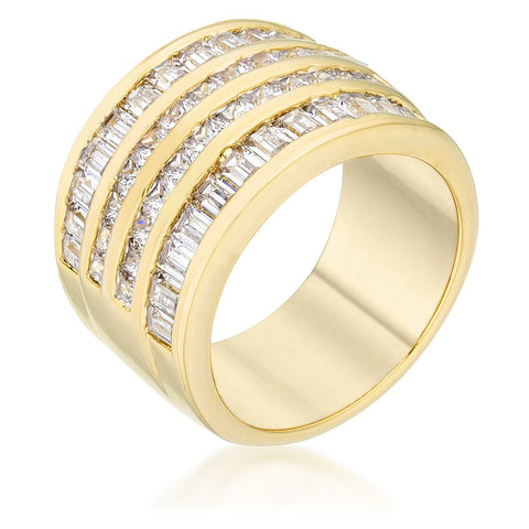 Four rows of baguettes and princess cut cubic zirconia line the front of this gorgeous cocktail ring. 18k plated gold is achieved using an electroplating process that coats the item with heavy layers of 18k Yellow Gold and color-treated to display a perfect 14k Hamilton gold color.