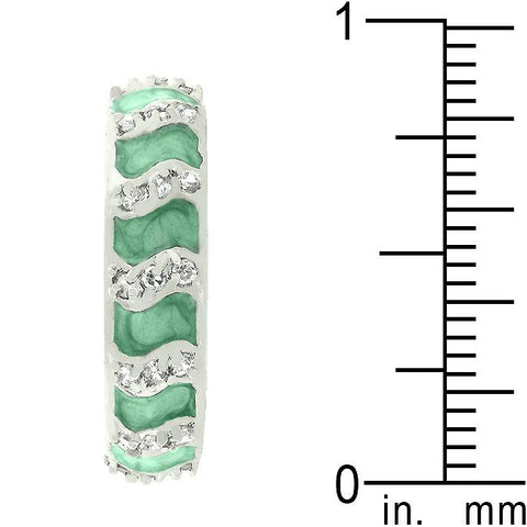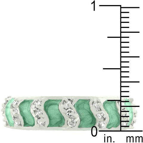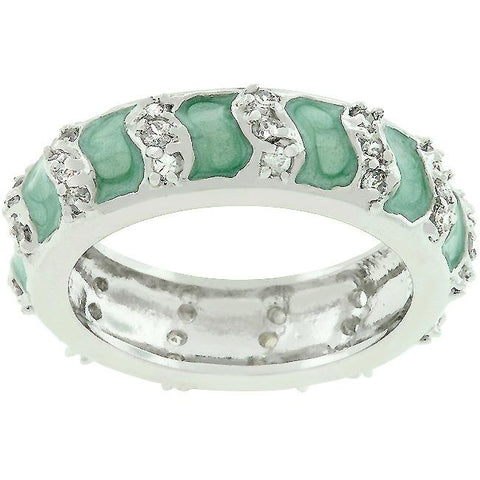 Aqua Eternity Enamel Ring features a shiny silver tone with prong set mini cubic zirconia inlaid in an eternity style. Genuine Rhodium Plating is achieved using an electroplating process that coats the item with heavy layers of rhodium a close cousin to platinum which gives our jewelry a platinum luster.
