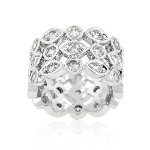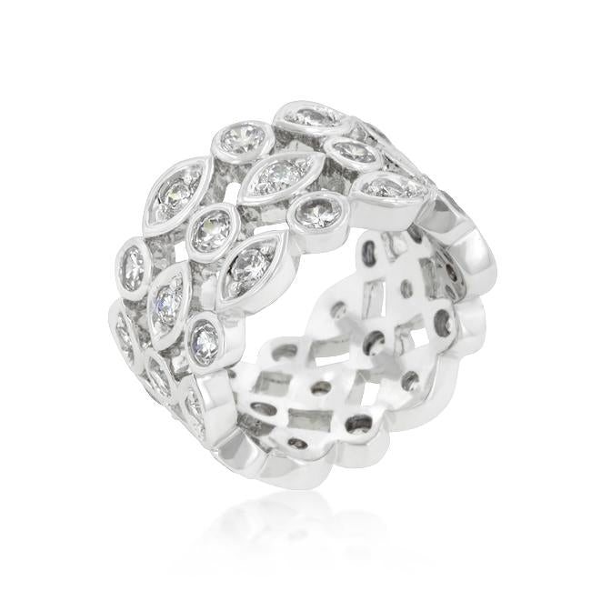 This vibrant eternity band will bring elegant luminescence to your daily wardrobe. Our genuine rhodium finish is achieved using an electroplating process that coats the item with heavy layers of rhodium a close cousin to platinum which gives our jewelry a platinum luster.